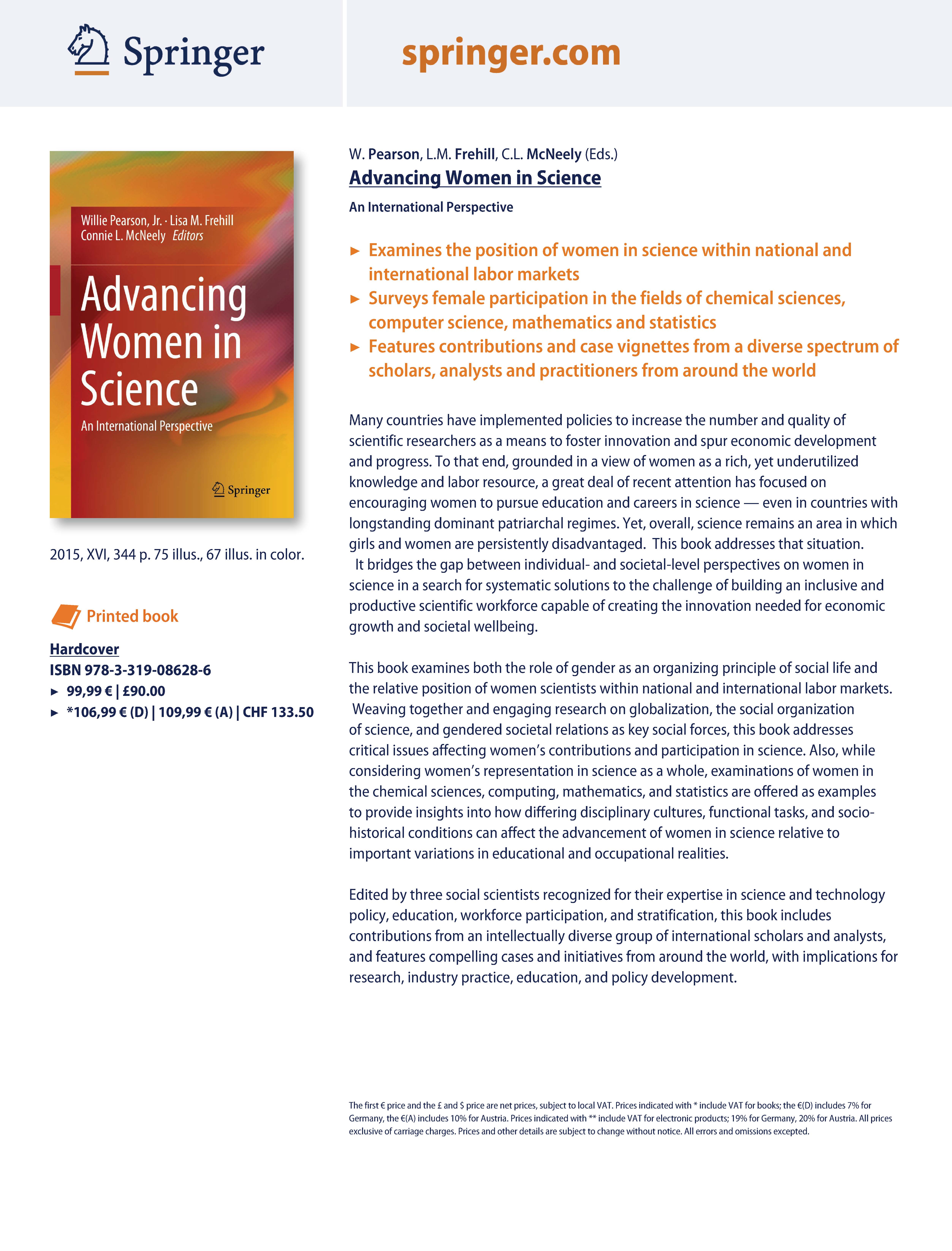 Willie Pearson, Jr., Lisa M. Frehill, Connie L. McNeely (Eds.) (2015). Advancing Women in Science.